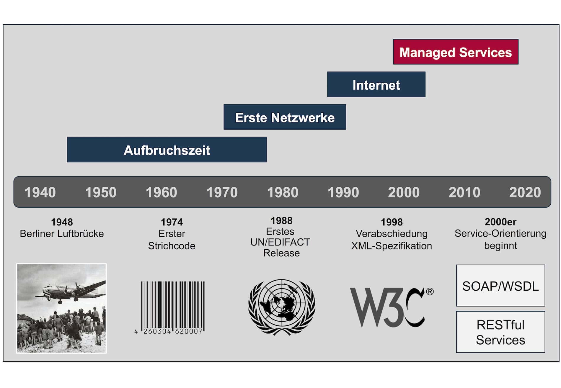 EDI (Electronic Data Interchange) hat eine bemerkenswerte Entwicklung hinter sich, die tief in der Geschichte der Logistik und Wirtschaft verwurzelt ist. Die ersten Ansätze des elektronischen Datenaustauschs entstanden bereits 1948, während der Berliner Luftbrücke. Als West-Berlin nach dem Zweiten Weltkrieg von der sowjetischen Besatzungszone abgeschnitten wurde, musste die Stadt ausschließlich per Luftbrücke versorgt werden. Um diese riesige logistische Herausforderung zu bewältigen, entwickelten die Alliierten standardisierte Frachtlisten, die elektronisch übermittelt werden konnten. Diese frühen Formen des Datenaustauschs bildeten das Fundament für die spätere Entwicklung von EDI.