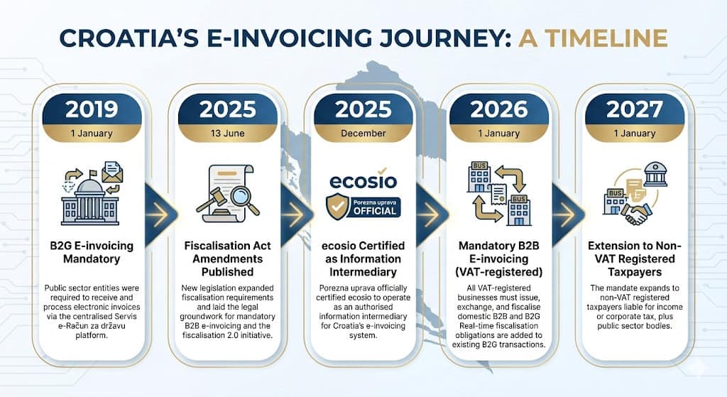 **2019: B2G e-invoicing becomes mandatory (1 January)** Public sector entities were required to receive and process electronic invoices via the centralised Servis e-Račun za državu platform. **2025: Fiscalisation Act amendments published (13 June)** New legislation expanded fiscalisation requirements and laid the legal groundwork for mandatory B2B e-invoicing and the fiscalisation 2.0 initiative. **2025: ecosio certified as information intermediary (December)** [Porezna uprava officially certified ecosio to operate as an authorised information intermediary for Croatia's e-invoicing system.](https://porezna-uprava.gov.hr/hr/popis-informacijskih-posrednika/8019) **2026: Mandatory B2B e-invoicing for VAT-registered taxpayers (1 January)** All VAT-registered businesses must issue, exchange, and fiscalise domestic B2B and B2G e-invoices. Real-time fiscalisation obligations are added to existing B2G transactions. **2027: Extension to non-VAT registered taxpayers (1 January)** The mandate expands to non-VAT registered taxpayers liable for income or corporate tax, plus public sector bodies.