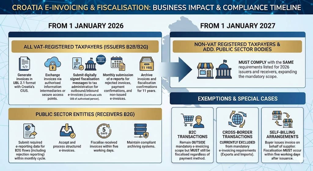 ## **From 1 January 2026:** **All VAT-registered taxpayers** issuing domestic B2B or B2G invoices must: - Generate invoices in UBL 2.1 format with Croatia's CIUS - Exchange invoices via authorised information intermediaries or secure access points - Submit digitally signed fiscalisation messages to the tax administration for both outbound and inbound e-invoices using a certificate that includes the OIB of the authorised person ([ecosio holds a certificate](https://porezna-uprava.gov.hr/hr/popis-informacijskih-posrednika/8019)). - Monthly submission of e-reports for rejected invoices, payment confirmations and cases where an e-invoice could not be issued electronically (non-issued e-invoices) - Archive invoices and fiscalisation confirmations for 11 years **Public sector entities** receiving B2G invoices must: - Submit required **e-reporting** data for B2G flows (including **rejection reporting** where applicable) within the monthly reporting cycle - Accept and process structured e-invoices - Fiscalise received invoices within five working days - Maintain compliant archiving systems ## **From 1 January 2027:** **Non-VAT registered taxpayers** liable for income or corporate tax, plus additional public sector bodies, must comply with the same requirements. ## **Exemptions and special cases:** **B2C transactions** remain outside the mandatory e-invoicing scope but must still be fiscalised regardless of payment method. **Cross-border transactions** (exports and imports) are currently excluded from the mandatory e-invoicing requirements. **Self-billing arrangements:** In self-billing scenarios, the buyer issues the invoice on behalf of the supplier. Fiscalisation must occur within five working days after invoice issuance.