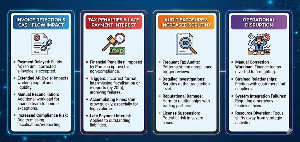 ## **Invoice rejection and cash flow impact** Invoices can be rejected by the recipient, which can delay payment until issues are corrected. Missing fiscalisation and e-reporting also create reconciliation work and increase compliance risk, meaning: - Payment may be delayed until a corrected e-invoice is issued and accepted - Your accounts receivable cycle may extend, impacting working capital - Your finance team may need additional manual reconciliation and exception handling ## **Tax penalties and late payment interest** Porezna uprava can impose financial penalties for: - Failure to issue e-invoices in the required format - Missing or late fiscalisation of invoice data - Non-submission of monthly e-reports by the 20th of each month - Failure to maintain 11-year archiving requirements Penalties can accumulate quickly, particularly for high-volume issuers, and late payment interest may apply. ## **Audit exposure and increased scrutiny** Businesses with patterns of non-compliance may face: - More frequent tax audits - Detailed transaction-level investigations - Reputational damage with trading partners - Potential suspension of trading licences in severe cases ## **Operational disruption** Beyond financial penalties, non-compliance creates: - Manual correction workload for finance teams - Strained relationships with customers and suppliers - System integration failures requiring emergency fixes - Resource diversion from strategic activities to firefighting