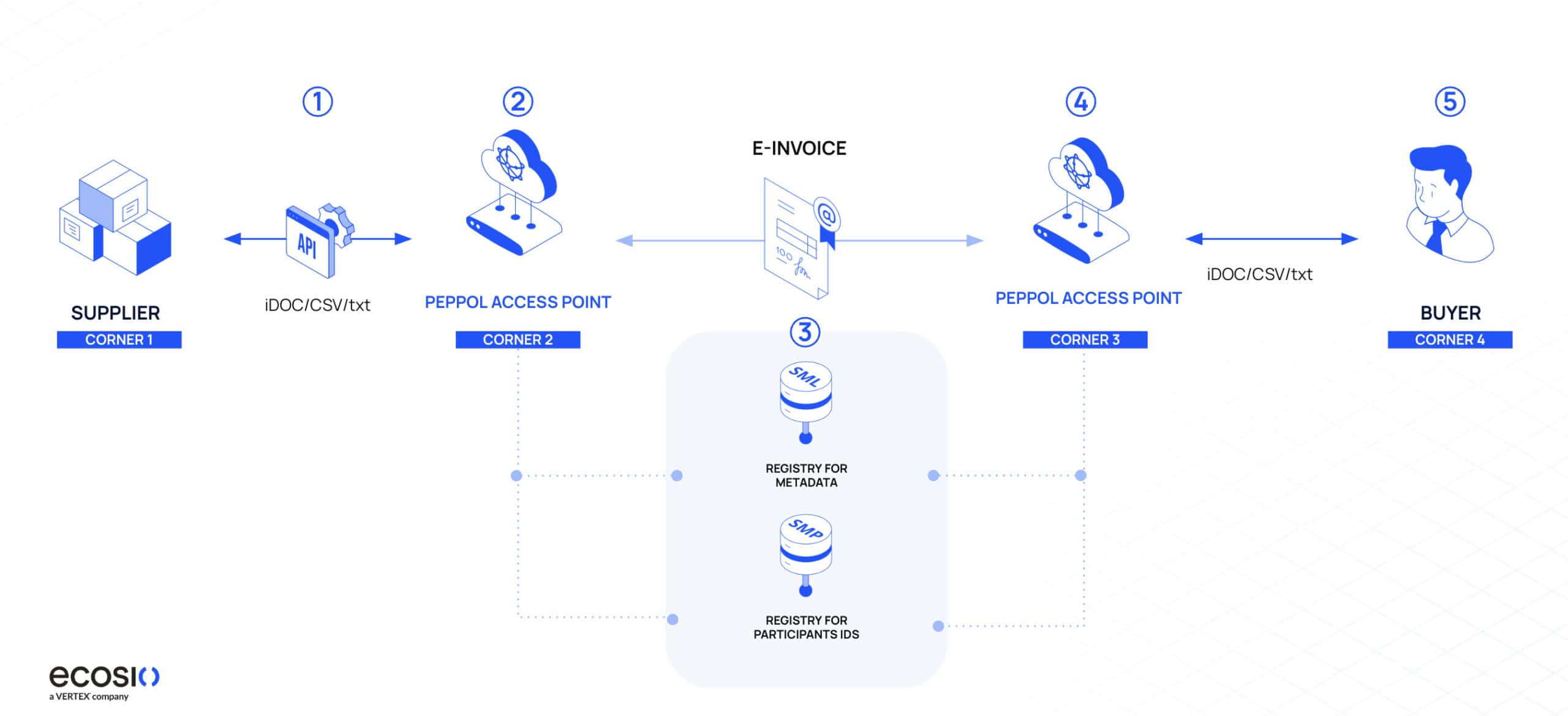 - The supplier (Corner 1) creates an invoice in their ERP